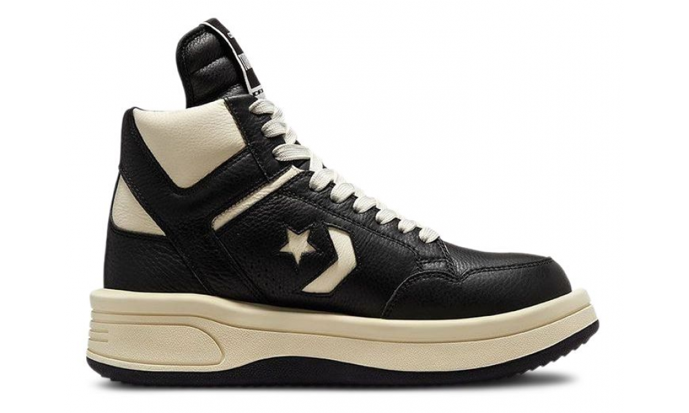 Модель отличается массивным силуэтом с выразительными объемными формами и характерной платформой, придающей дополнительный рост и уверенность в каждом шаге. Верх из высококачественной черной кожи и текстиля в черных и молочный оттенках дает эффектный контраст, подчёркивая современный урбанистический стиль. Особое внимание уделено деталям: фирменные элементы Rick Owens и классический логотип Converse гармонично сочетаются, создавая неповторимый визуальный акцент.
